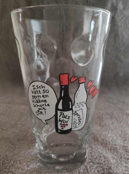 Das pfälzer Nationalgetränk, die Schorle, erhält ein eigenes Motiv auf dem Dubbeglas mit dem die innige Liebe zwischen Wein und Sprudel zur Entstehung der Schorle deutlich wird.